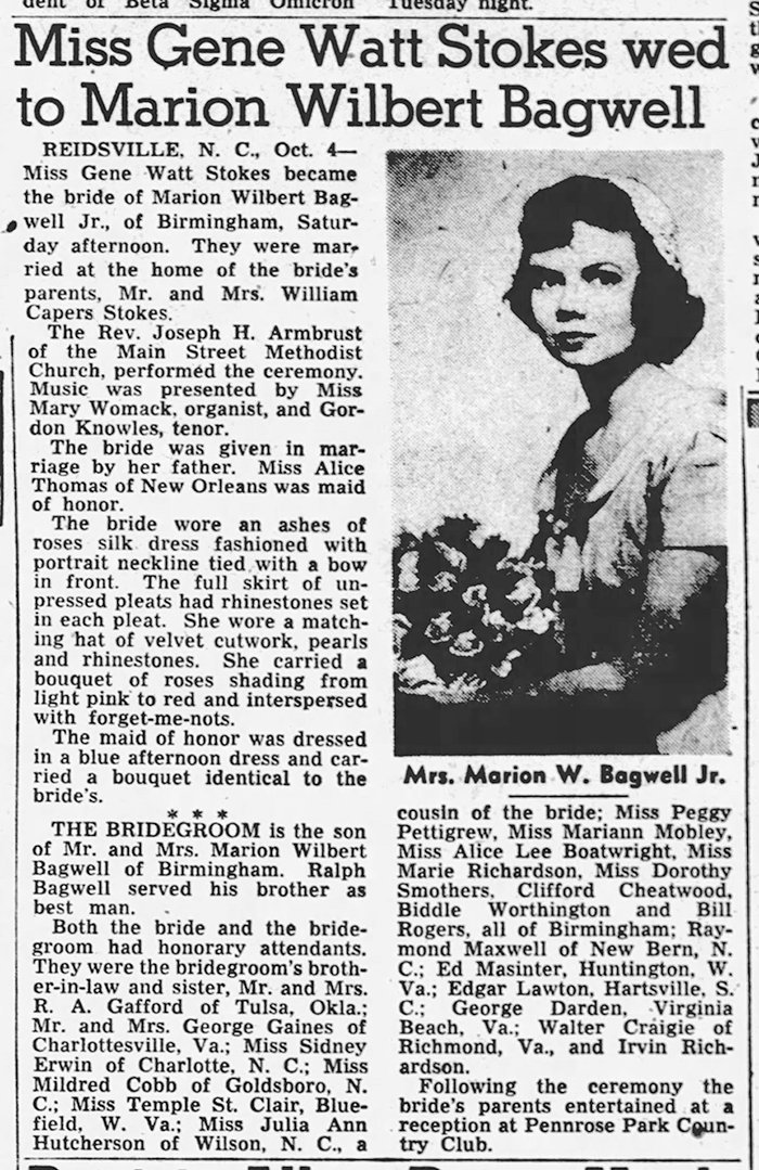 Surviving are wife, Gene Watt Stokes Bagwell; daughters, Sarah Lindsey Bagwell Strope of Roxboro, Virginia Stokes Bagwell Gosser of Reidsville; son, Marion W. Bagwell III of Greensboro; sister, Jacquiline Grey of Birmingham, Ala; brother, Ralph C. Bagwell of Guadalajara, Mexico; seven grandchildren.