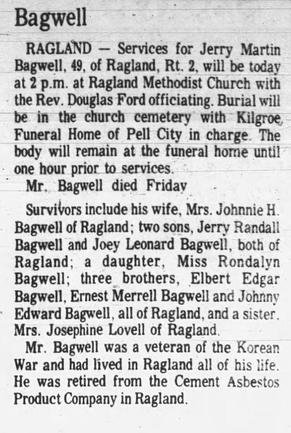 Jerry Martin Bagwell was born on 16 August 1929 in Alabama. He was the son of Robert Lee Bagwell and Ada Wester. Jerry Martin Bagwell married Johnnie Bee Hollingsworth after 1947. He served in the US Army from 30 August 1950 to 11 August 1954. Jerry Martin Bagwell died on 9 March 1979 in Ragland, Alabama, at age 49. He was buried on 11 March 1979 at Ragland Methodist Church Cemetery, Ragland, Alabama.