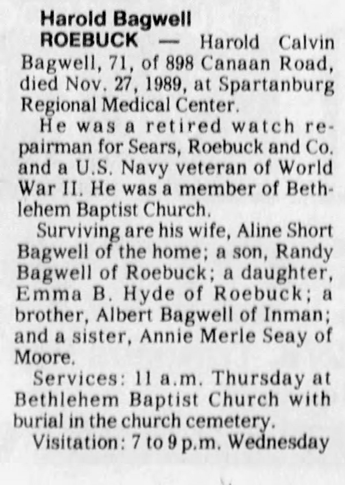 Harold Calvin Bagwell was born on 12 July 1918 in Spartanburg County, South Carolina. He was the son of Dock Cleveland Bagwell and Clara Azile Brannon. Harold Calvin Bagwell married Stella Aline Short after 1940. He enlisted in the U.S. Navy on 10 January 1939 and served during World War II. He survived the bombing of Pearl Harbor and his ship being sunk in the South Pacific. He was discharged 4 October, 1945. Harold Calvin Bagwell died on 27 November 1989 in Spartanburg County, South Carolina, at age 71. He was buried at Bethlehem Baptist Church Cemetery, Moore, Spartanburg County, South Carolina.