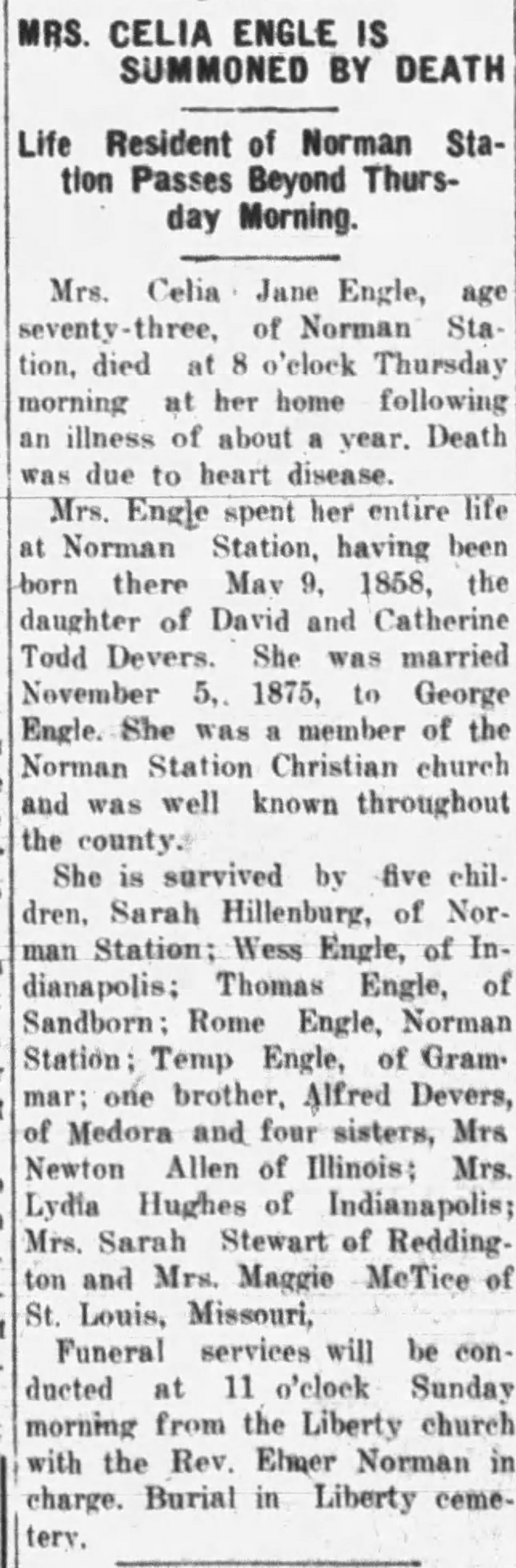 Celia Jane Davers was born on 9 May 1858 in Norman Station, Indiana. As of 5 November 1875,her married name was Engle. She married George William Engle, son of Charles Engle and Rebecca Edwards, on 5 November 1875 at Indiana. Celia Jane Davers died on 4 February 1932 in Norman Station, Indiana, at age 73. She was buried on 7 February 1932 at Liberty Cemetery, Norman Station, Jackson County, Indiana.