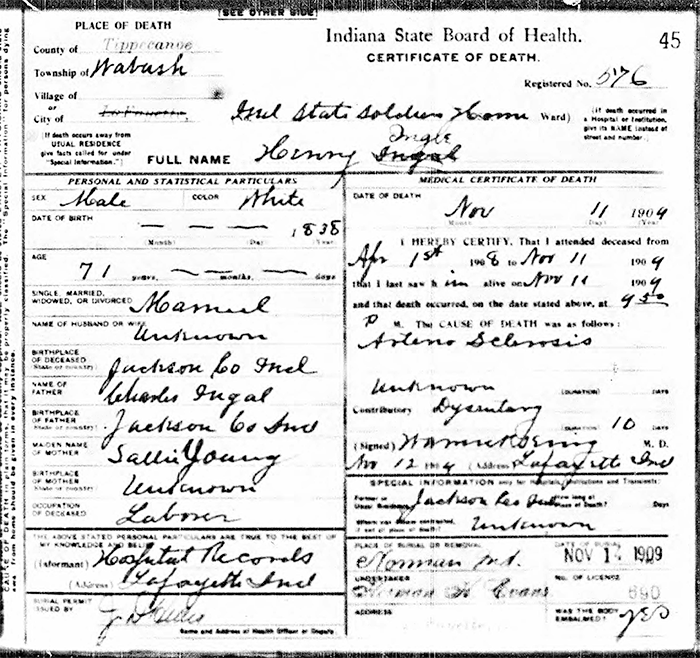 Henry Engle was also known as Henry Ingle.1,2 He was born in 1838 in Jackson County, Indiana.1,2 He was the son of Charles Engle and Sarah Young. Henry Engle married Mary Etta Wagoner on 6 April 1868 at Brown County, Indiana. Henry Engle died on 11 November 1909 in Fayetteville, Tippecanoe County, Indiana.