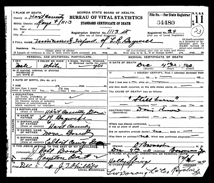 - Infant Male Bagwell b. 4 Dec 1920, d. 4 Dec 1920