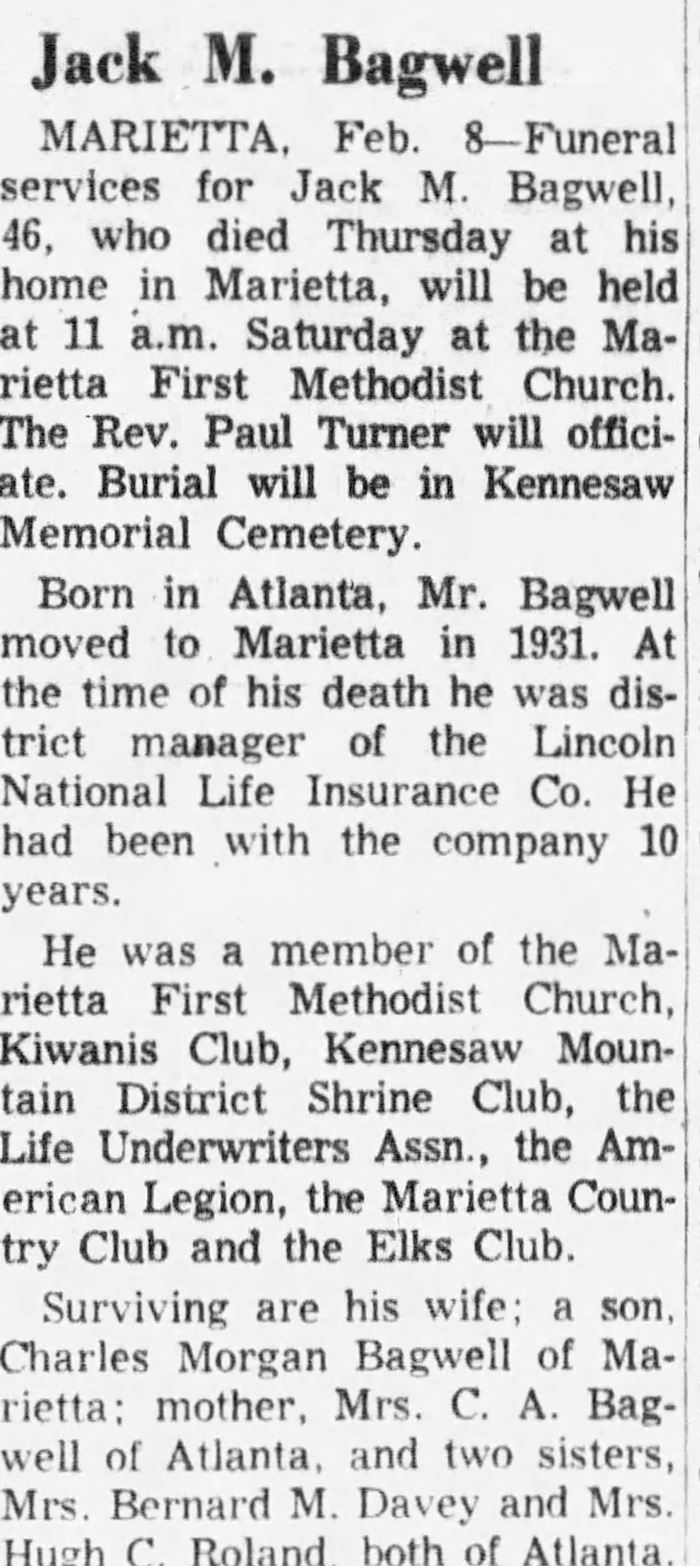 Jack Morgan Bagwell was born on 20 April 1910 in Atlanta, Georgia.1 He was the son of Chester Augustus Bagwell and Ethel J. Morgan. Jack Morgan Bagwell married Mary Helen Crowder before 1938. Jack Morgan Bagwell died on 7 February 1957 in Marietta, Cobb County, Georgia, at age 46.1 He was buried at Kennesaw Memorial Park, Marietta, Cobb County, Georgia.1