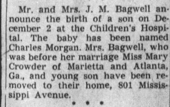 - Charles Morgan Bagwell b. 2 Dec 1938, d. 22 Dec 1959