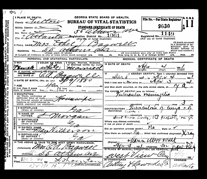 Ethel J. Morgan was born on 19 March 1881 in Georgia.1 As of 21 December 1904,her married name was Bagwell. She married Chester Augustus Bagwell, son of George Washington Bagwell and Matilda Ann Hubbard, on 21 December 1904. Ethel J. Morgan died on 4 April 1921 in Atlanta, Fulton County, Georgia, at age 40.1 She was buried on 5 April 1921 at Westview Cemetery, Atlanta, Fulton County, Georgia.1