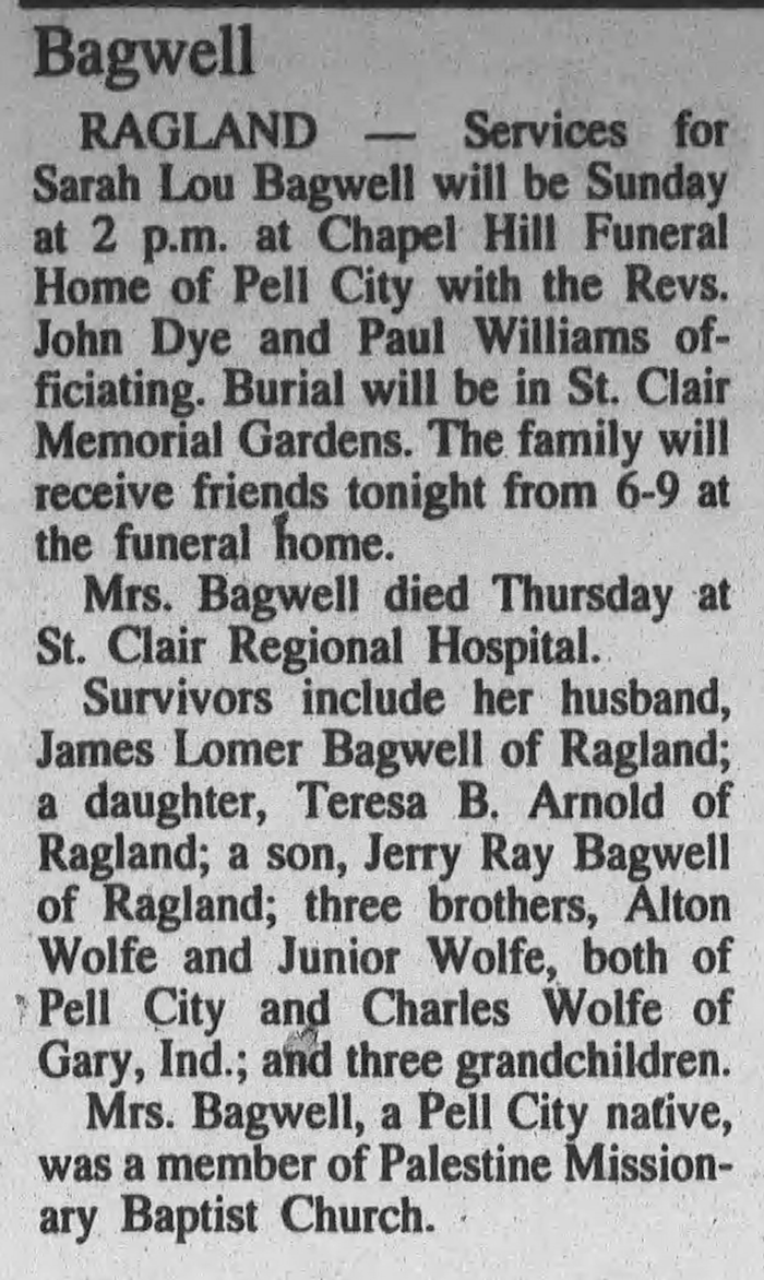 James Lomer Bagwell was also known as James "Jank" Bagwell. He was born on 31 March 1934 in Alabama. He was the son of Joseph Watt Bagwell and Lucille Reaves. James Lomer Bagwell married Sarah Lucile Macon in June 1954 at Shelby County, Alabama. James Lomer Bagwell died on 27 January 2018 at age 83. He was buried at Saint Clair Memorial Gardens, Pell City, St. Clair County, Alabama.