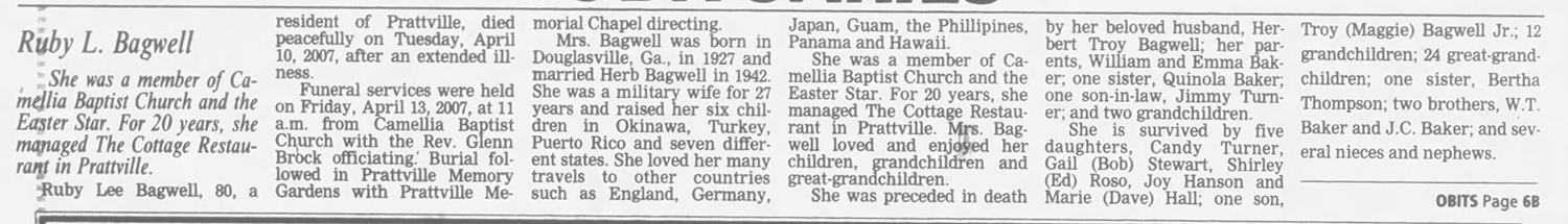 BAGWELL, Ruby Lee, 80, a resident of Prattville, AL died peacefully on Tuesday, April 10, 2007, after an extended illness. Funeral services will be on Friday, Apil 13, 2007 a 11 a.m. from Camellia Baptist Church, with Rev. Glenn Brock officiating. Burial will follow in Prattville Memory Gardens with Prattville Memorial Chapel directing.