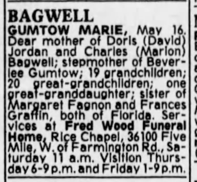 - [S7134] Marie Bagwell Gumtow Grave Stone, Find a Grave, www.findagrave.com, https://www.findagrave.com/memorial/13837208