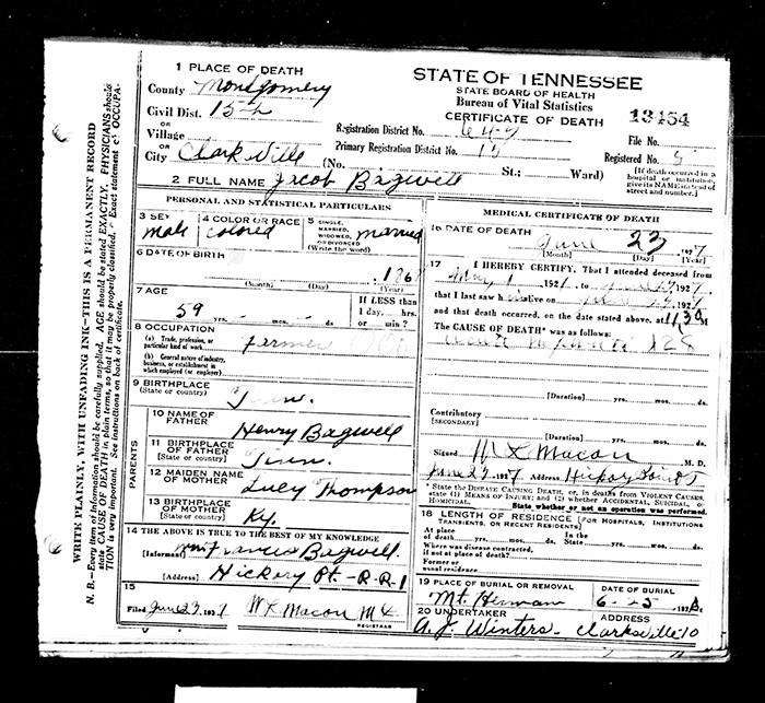 James Bagwell was born circa 1861 in Montgomery County, Tennessee. He was born in 1865 in Tennessee.1 He was the son of Henry Bagwell and Lucy Thompson. James Bagwell died on 27 April 1925 in Clarksville, Montgomery County, Tennessee, A teamster, he was 60 years old when he died of the flu on April 27, 1925 in Clarksville. Burial was the next day in Mount Herman Cemetery.1 He was buried on 28 April 1925 at Mt Herman Community Church Cemetery, Hickory Point, Montgomery County, Tennessee.1