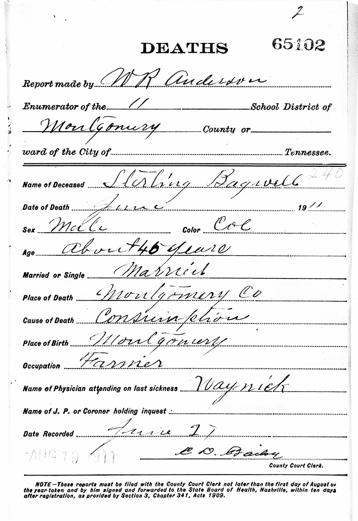 Sterling Bagwell was also known as Sterlin Bagwell. He was born in June 1865 in Tennessee. He was the son of Henry Bagwell and Lucy Thompson. Sterling Bagwell married Mary Turnley in 1885 at Montgomery County, Tennessee. Sterling Bagwell died in July 1911 in Montgomery County, Tennessee, at age 46 of consumption (tuberculosis.)