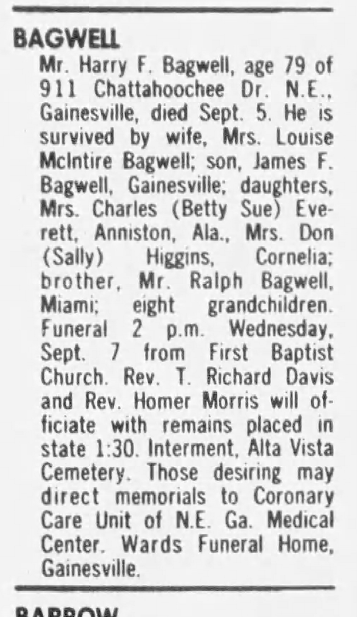 Harry Frank Bagwell was born on 4 August 1904 in Hall County, Georgia. He was the son of George Franklin Bagwell and Lena Meaders. Harry Frank Bagwell married Sally Grace Buice circa 1929. Harry Frank Bagwell married Louise McIntire before 1983. Harry Frank Bagwell died on 5 September 1983 in Gainesville, Hall County, Georgia, at age 79. He was buried on 7 September 1983 at Alta Vista Cemetery, Gainesville, Hall County, Georgia.