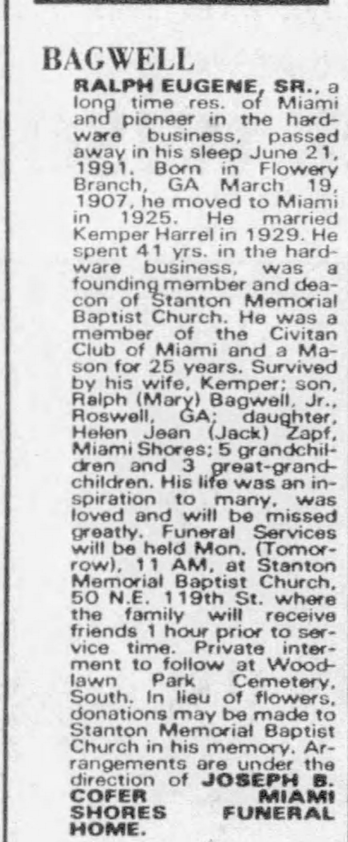 Ralph Eugene Bagwell was born on 19 March 1907 in Flowery Branch, Hall County, Georgia. He was the son of George Franklin Bagwell and Lena Meaders. Ralph Eugene Bagwell married Kemper Rejelle Harrell on 27 September 1930 at Florida. Ralph Eugene Bagwell died on 21 June 1991 in Miami, Florida, at age 84. He was buried at Woodlawn Park Cemetery South, Miami, Miami-Dade County, Florida.