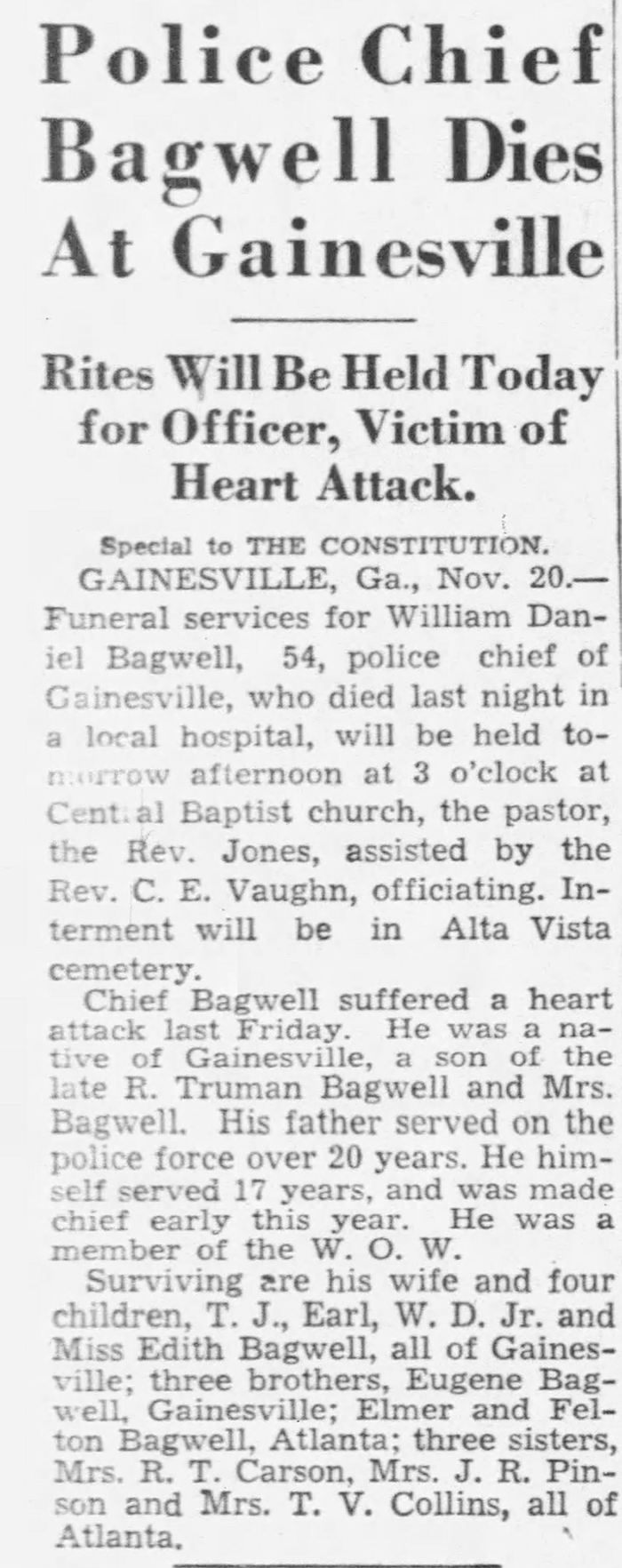 William Daniel Bagwell Jr. was born on 2 May 1919. He was the son of William Daniel Bagwell and Vena Phillips McKibben. William Daniel (Bill) Bagwell was the third generation to serve as Gainesville Police Chief. He later worked for the FBI. He was married to Betty Ruth Bryan Bagwell. William Daniel Bagwell Jr. married Betty Ruth Bryan in 1950. William Daniel Bagwell Jr. died on 17 January 1982 at age 62. He was buried at Alta Vista Cemetery, Gainesville, Hall County, Georgia.