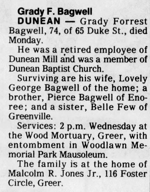 Lovely Mae George was born on 27 November 1905. She married Grady Forrest Bagwell, son of Marion Newton Bagwell and Mary Etta Bearden, after 1925. Lovely Mae George died in 1987 in Spartanburg County, South Carolina. She was buried at Woodlawn Memorial Park, Greenville, Greenville County, South Carolina.