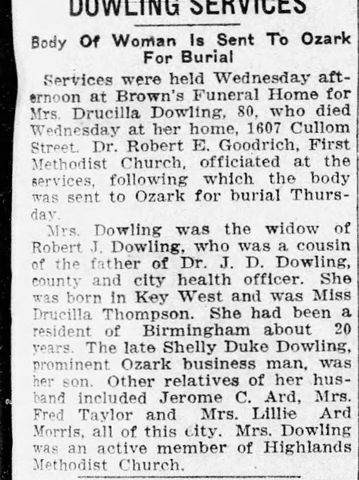 Drucilla Thompson was born on 4 October 1852 in Jacksonville, Duval County, Florida. Her married name was Dowling. She married Robert James Dowling, son of Edward Dowling and Anna Melissa Oates. Drucilla Thompson died on 31 August 1932 in Birmingham, Jefferson County, Alabama, at age 79. She was buried at Claybank Cemetery, Ozark, Dale County, Alabama.