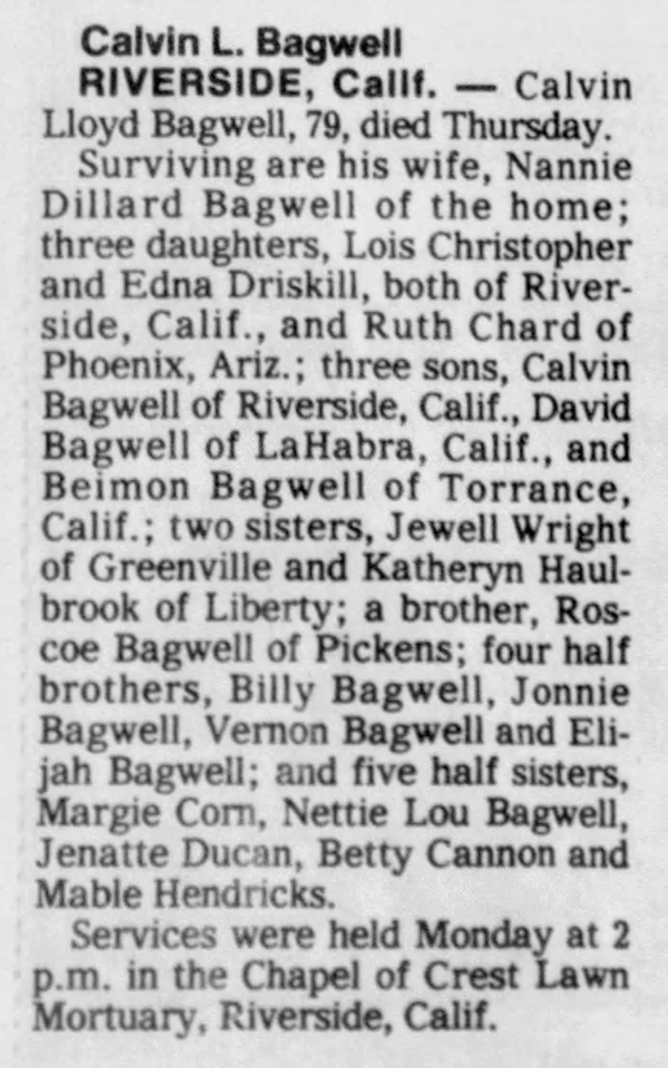 Calvin Lloyd Bagwell was also known as Lloyd Calvin Bagwell. He was born on 12 November 1904 in Pickens County, South Carolina. He was the son of Elijah Walker Bagwell and Leotto Cantrell. Calvin Lloyd Bagwell married Nannie Etta Dillard before 1927 at South Carolina. Calvin Lloyd Bagwell married Nannie Etta Dillard on 3 July 1976 at Riverside, California. Calvin Lloyd Bagwell died on 22 March 1984 in Riverside, California, at age 79. He was buried at Crestlawn Memorial Park, Riverside, Riverside County, California.