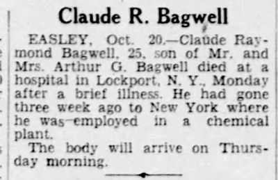 Claude Raymond Bagwell was born in 1917 in South Carolina.1 He was the son of Arthur Gardner Bagwell and Lillie Mae Jones.2 Claude Raymond Bagwell married Elizabeth Lesley after 1935. Claude Raymond Bagwell died in 1942 in Lockport, New York.1,2 He was buried at West View Cemetery, Easley, Pickens County, South Carolina.1