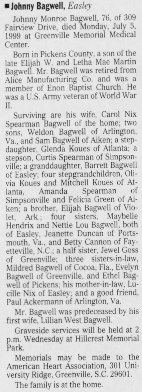 - Johnny Monroe Bagwell+ b. 11 Oct 1922, d. 5 Jul 1999