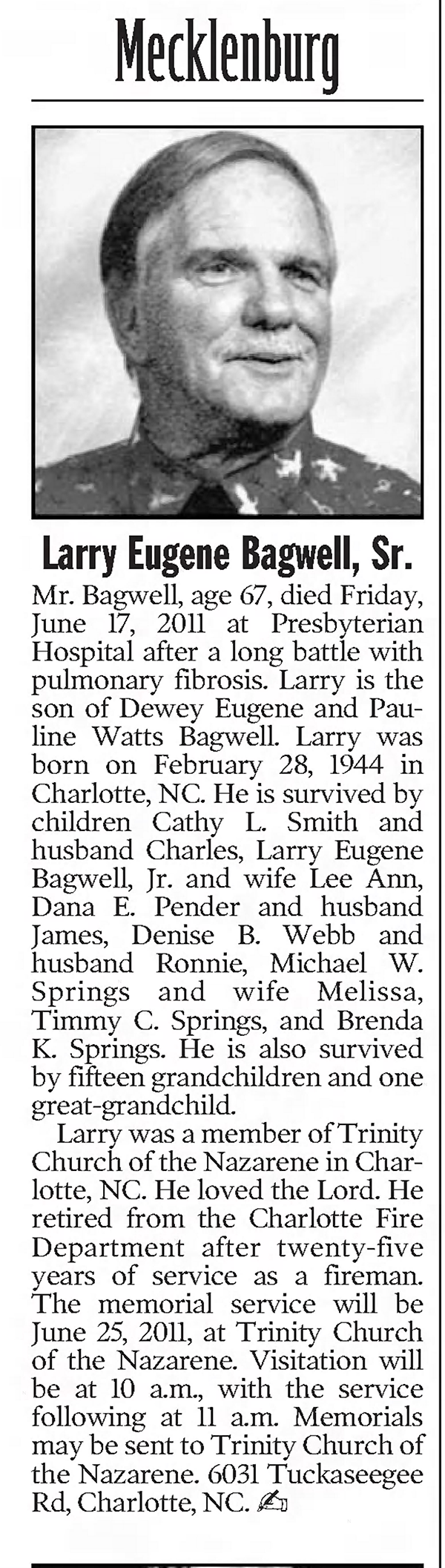 Larry Eugene Bagwell was born on 28 February 1944 in Mecklenburg County, North Carolina. He was the son of Dewey Eugene Bagwell and Pauline Elizabeth Watts. Larry Eugene Bagwell married Joyce Sandra Watkins before 1980. Larry Eugene Bagwell and Joyce Sandra Watkins were divorced on 9 June 1980 at Mecklenburg County, North Carolina. Larry Eugene Bagwell married Sandra Lou Springs on 29 August 1980 at Mecklenburg County, North Carolina. Larry Eugene Bagwell married Margaret Jackson Tucker on 25 October 1996 at Mecklenburg County, North Carolina. Larry Eugene Bagwell died on 17 June 2011 in Charolette, Mecklenburg County, North Carolina, at age 67.