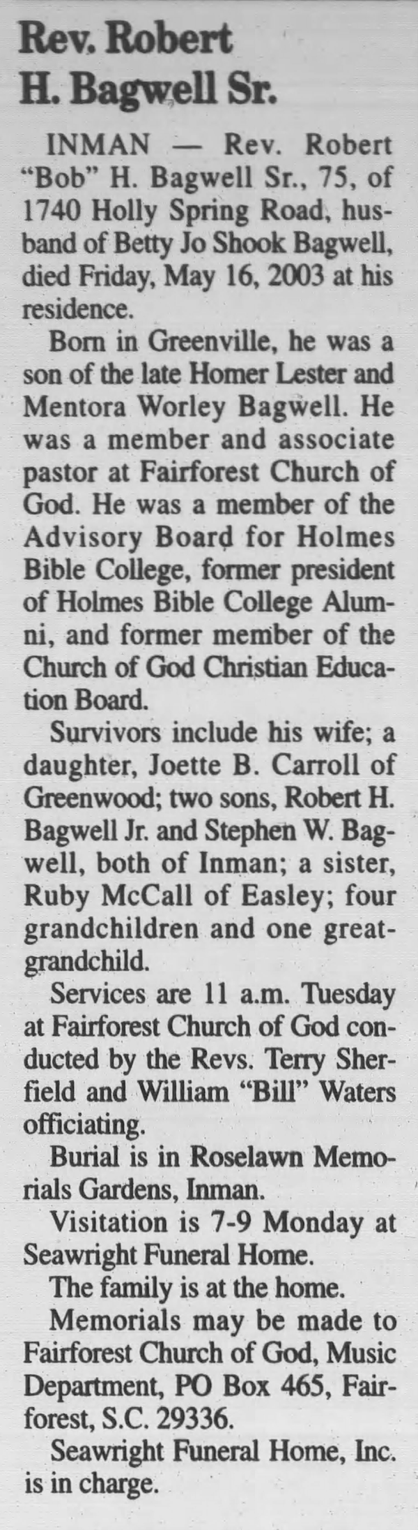 - Reverend Robert Henry "Bob" Bagwell+ b. 23 Apr 1928, d. 16 May 2003