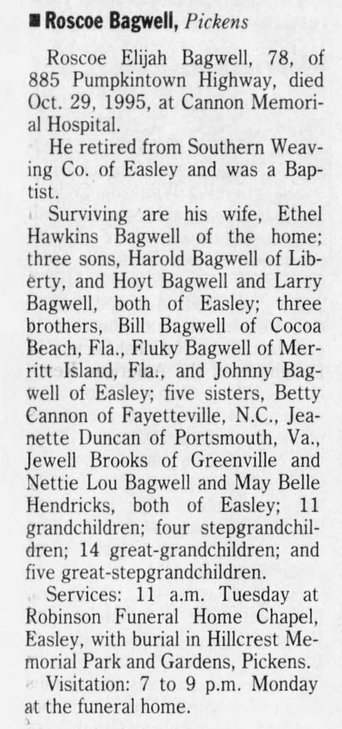 Roscoe Elijah Bagwell was born on 25 January 1917 in Pickens County, South Carolina.1 He was the son of Elijah Walker Bagwell and Leotto Cantrell. Roscoe Elijah Bagwell married Ethel Mae Hawkins after 1938.2 Roscoe Elijah Bagwell died on 29 October 1995 in Pickens, Pickens County, South Carolina, at age 78.1 He was buried on 31 October 1995 at Hillcrest Memorial Park, Pickens, Pickens County, South Carolina.1