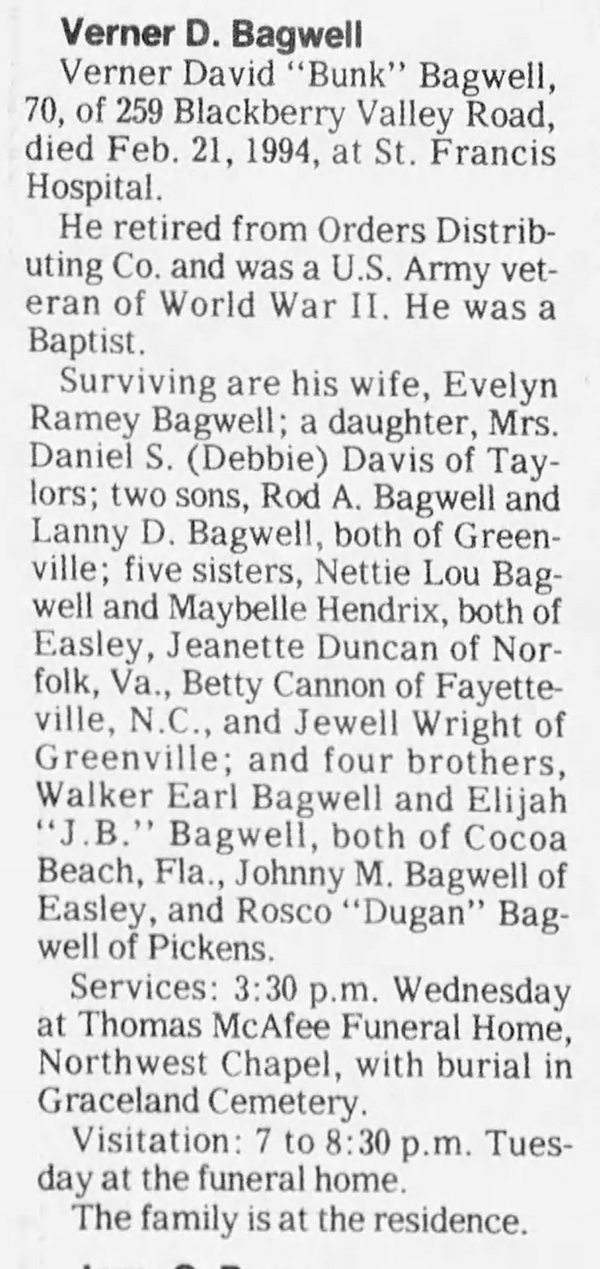 Dewey Eugene Bagwell was born on 1 April 1920 in Easley, Pickens County, South Carolina.1 He was the son of Arthur Gardner Bagwell and Lillie Mae Jones.2,3,4 Dewey Eugene Bagwell married Pauline Elizabeth Watts circa 1943. Dewey Eugene Bagwell died on 27 September 2005 in Charlotte, Mecklenburg County, North Carolina, at age 85.1,3 He was buried at Sharon Memorial Park, Charlotte, Mecklenburg County, North Carolina.1