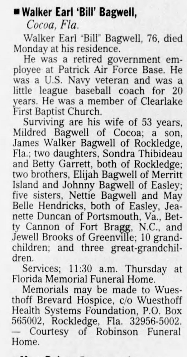 Walker Earl Bagwell was born on 6 August 1921 in Pickens County, South Carolina.1 He was the son of Elijah Walker Bagwell and Leitha Mae Martin. He served as Navy Seaman 1st Class (S1) in the US Navy during World War II.1 Walker Earl Bagwell married Mildred Gertrude Ravan in February 1945. Walker Earl Bagwell died on 23 February 1998 in Cocoa, Brevard County, Florida, at age 76.1 He was buried on 5 March 1998 at Florida Memorial Gardens, Rockledge, Brevard County, Florida.1