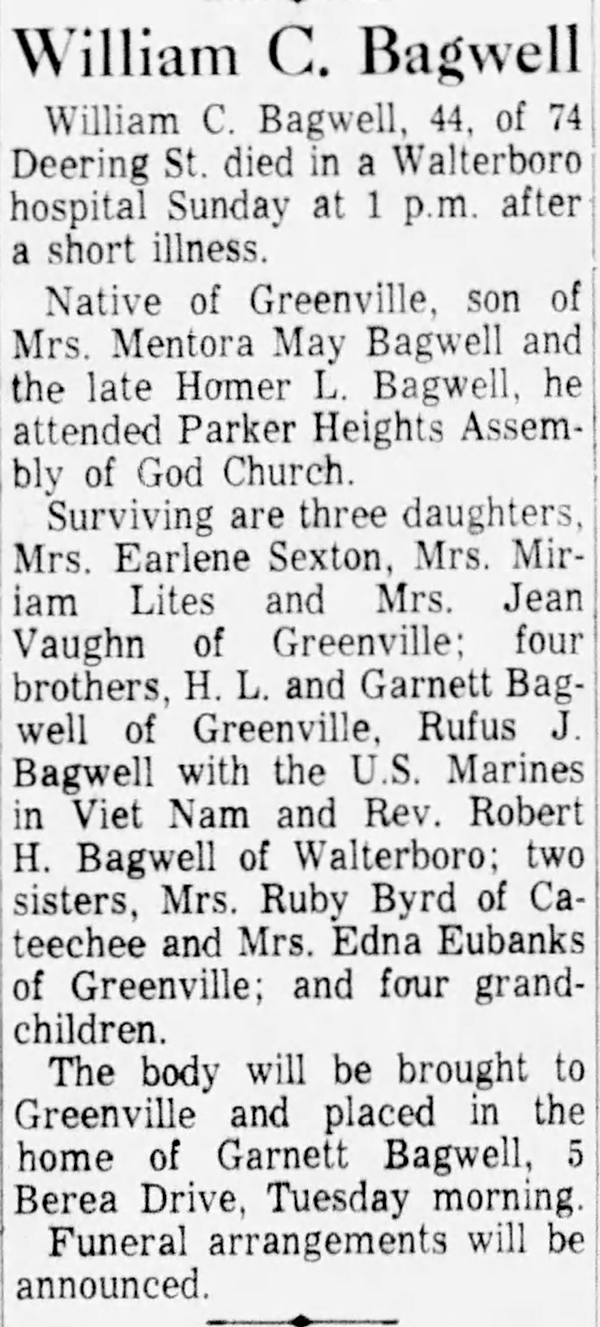 - [S7038] The Greenville News (Greenville, South Carolinia), November 13, 1965, Page: 15.