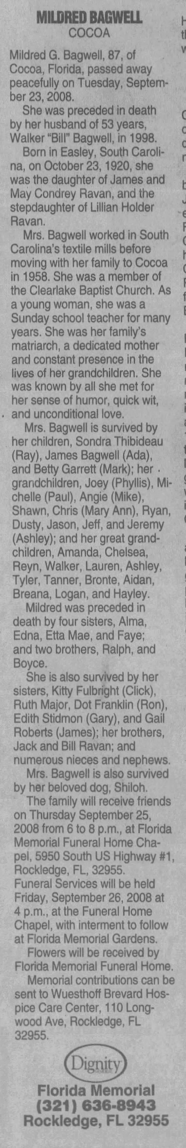 Mildred Gertrude Ravan was born on 23 October 1920 in Easley, Pickens County, South Carolina.1 As of February 1945,her married name was Bagwell. She married Walker Earl Bagwell, son of Elijah Walker Bagwell and Leitha Mae Martin, in February 1945. Mildred Gertrude Ravan died on 23 September 2008 in Cocoa, Brevard County, Florida, at age 87 MILDRED BAGWELL COCOA Mildred G. Bagwell, 87, of Cocoa, Florida, passed away peacefully on Tuesday, September 23, 2008. She was preceded in death by her husband of 53 years, Walker "BilI" Bagwell, in 1998. Born in Easley, South Carolina, on October 23, 1920, she was the daughter of James and May Condrey Ravan, and the stepdaughter of Lillian Holder Ravan. Mrs. Bagwell worked in South Carolinas textile mills before moving with her family to Cocoa in 1958. She was a member of the Clearlake Baptist Church. As a young woman, she was a Sunday school teacher for many years. She was her family's matriarch, a dedicated mother and constant presence in the lives of her grandchildren. She was known by all she met for her sense of humor, quick wit, and unconditional love. Mrs. Bagwell is survived by her children, Sondra Thibideau (Ray), James Bagwell (Ada), and Betty Garrett (Mark); her grandchildren, Joey (Phyllis), Michelle (Paul), Angie (Mike), Shawn, Chris (Mary Ann), Ryan, Dusty, Jason, Jeff, and Jeremy (Ashley); and her great grand children, Amanda, Chelsea, Reyn, Walker, Lauren, Ashley, Tyler, Tanner, Bronte, Aidan, Breana, Logan, and Hayley. Mildred was preceded in death by four sisters, Alma, Edna, Etta Mae, and Faye; and two brothers, Ralph, and Boyce. She is also survived by her sisters, Kitty Fulbright (Click), Ruth Major, Dot Franklin (Ron), Edith Stidmon (Gary), and Gail Roberts (James); her brothers, Jack and Bill Ravan; and numerous nieces and nephews. Mrs. Bagwell is also survived by her beloved dog, Shiloh. The family will receive friends on Thursday September 25, 2008 from 6 to 8 p.m., at Florida Memorial Funeral Home Chapel, 5950 South US Highway #1, Rockledge, FL, 32955. Funeral Services will be held Friday, September 26, 2008 at 4 p.m., at the Funeral Home Chapel, with interment to follow at Florida Memorial Gardens. Flowers will be received by Florida Memorial Funeral Home. Memorial contributions can be sent to Wuesthoff Brevard Hospice Care Center, 110 Longwood Ave, Rockledge, FL 32955.1 She was buried at Florida Memorial Gardens, Rockledge, Brevard County, Florida.1