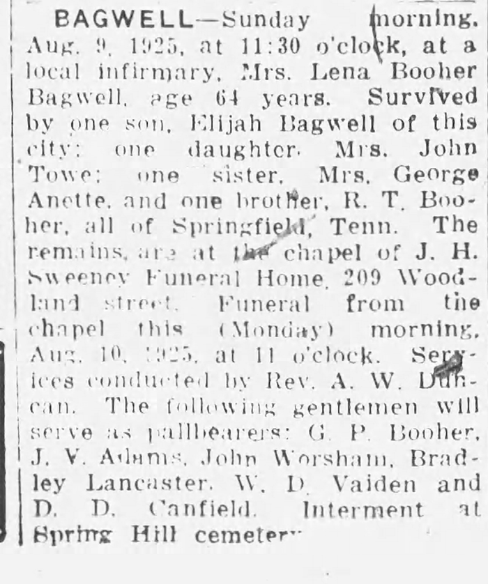 Maloney 'Lena' Booher was born in June 1861 in Robertson County, Tennessee. She married John Henry Bagwell, son of Emeline Larison, on 8 March 1882. Maloney 'Lena' Booher died on 9 August 1925 in Nashville, Davidson County, Tennessee, at age 64. She was buried on 10 August 1925 at Spring Hill Cemetery, Nashville, Tennessee.