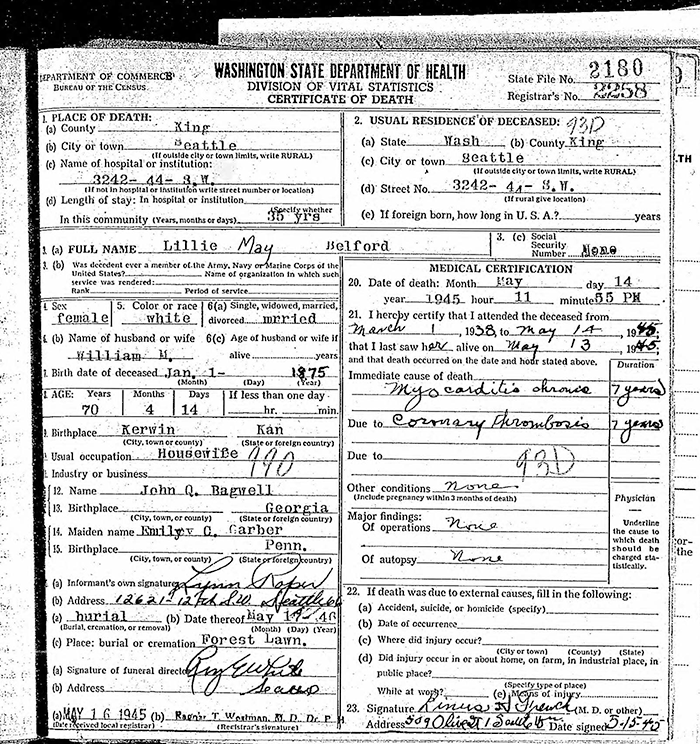 Lillie May Bagwell was born on 1 January 1875 in Kirwin, Phillips County, Kansas.1 She was the daughter of John Quincy Adams Bagwell and Emily Caroline "Carrie" Garber. As of 31 January 1898,her married name was Belford. Lillie May Bagwell married William M. Belford on 31 January 1898 at Pottawatomie County, Oklahoma. Lillie May Bagwell died on 14 May 1945 in Seattle, King County, Washington, at age 70.1 She was buried at Forest Lawn Cemetery, Seattle, King County, Washington.