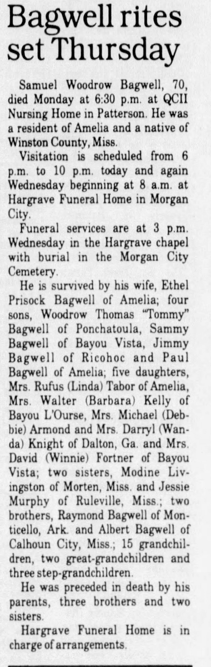 Samuel Woodrow Bagwell was born on 26 September 1922 in Winston, Mississippi. He was the son of Samuel Whitfield Bagwell and Alice Theodocia "Allie" Barnes. Samuel Woodrow Bagwell married Ethel Lou Prisock on 31 December 1944 at Grenada, Mississippi. Samuel Woodrow Bagwell lived in 1976 in Morgan City, Louisiana.1 He died on 14 June 1993 in Morgan City, St. Mary County, Louisiana, at age 70. He was buried on 16 June 1993 at Morgan City and Mausoleum, Morgan City, St. Mary Parish, Louisiana.