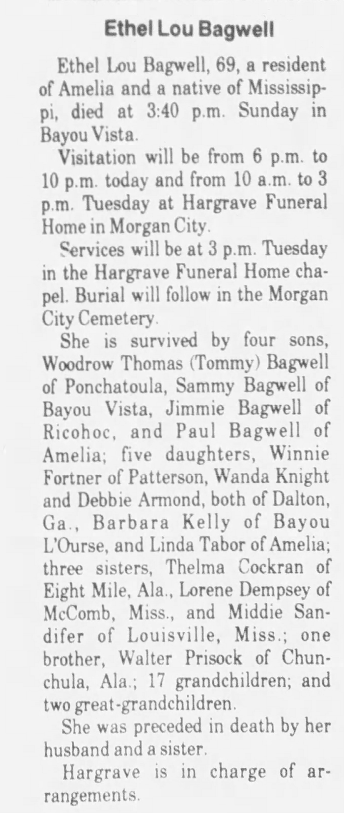 Ethel Lou Prisock was born on 18 May 1925 in Winston County, Mississippi. She married Samuel Woodrow Bagwell, son of Samuel Whitfield Bagwell and Alice Theodocia "Allie" Barnes, on 31 December 1944 at Grenada, Mississippi. Ethel Lou Prisock died on 22 May 1994 in Morgan City, Louisiana, at age 69. She was buried on 24 May 1994 at Morgan City and Mausoleum, Morgan City, St. Mary Parish, Louisiana.