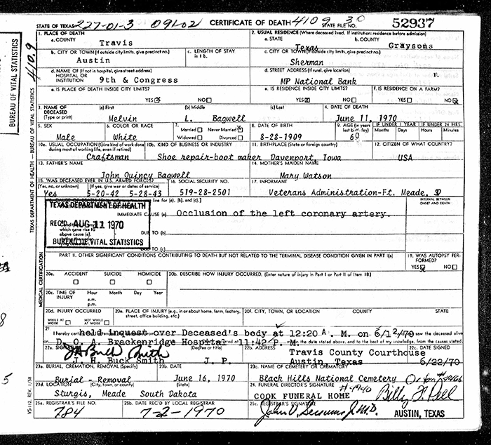 Melvin Lawson Bagwell was born on 28 August 1909 in San Jose County, California. He was the son of John Quincy Adams Bagwell and Anna Watts. Melvin Lawson Bagwell married Catherin Deane Conn on 14 September 1939 at Lewis and Clark County, Montana. Melvin Lawson Bagwell lived in 1940 in Sheridan, Sheridan County, Wyoming. Served as Technician 5th Grade( TEC5) 25 Base Post Office during World War II. He died on 11 June 1970 in Austin, Travis County, Texas, at age 60. He was buried at Black Hills National Cemetery, Sturgis, Meade County, South Dakota.