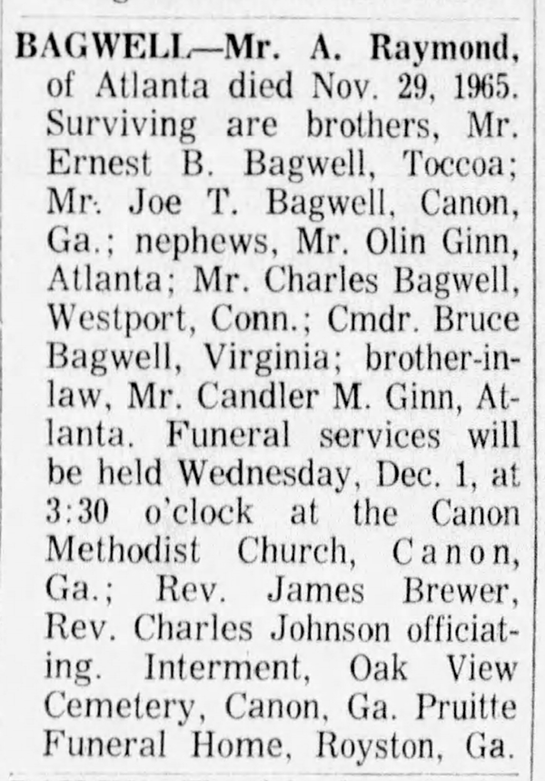 Albert Raymond Bagwell - 1893 to 1965 - Obituary
