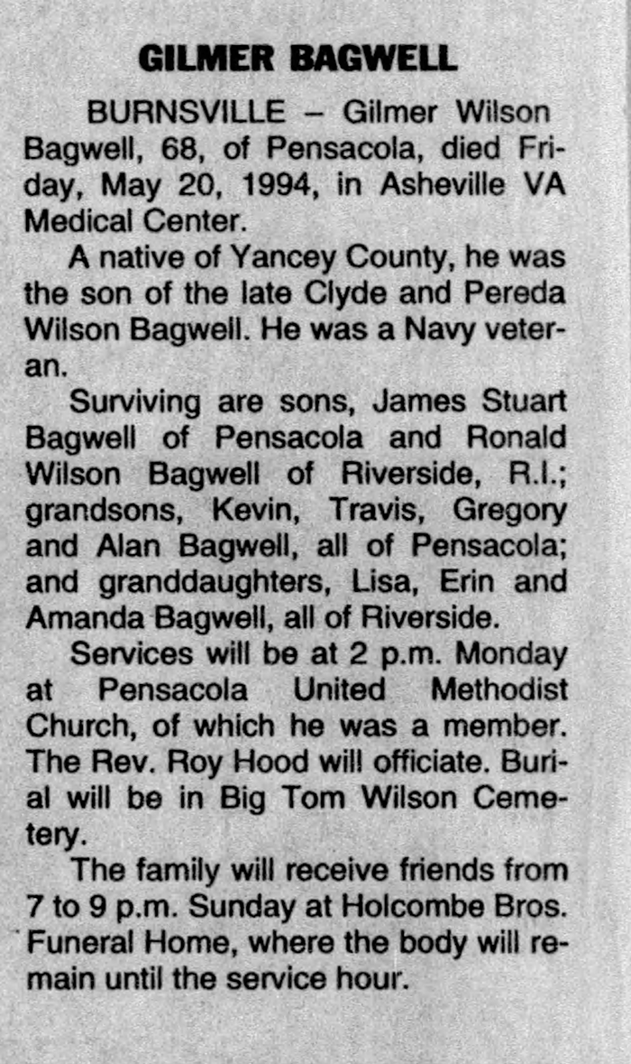 Gilmer Wilson Bagwell was born on 17 May 1926 in Yancey County, North Carolina. He was the son of Clyde Gilmer Bagwell and Sarah Pereda Wilson. He served in the US Navy. Gilmer Wilson Bagwell married Dorothy A. Ronald on 6 January 1951. Gilmer Wilson Bagwell died on 20 May 1994 in Asheville VA Medical Center, Asheville, Buncombe County, North Carolina, at age 68. He was buried on 23 May 1994 at Big Tom Wilson Family Cemetery, Pensacola, Yancey County, North Carolina.