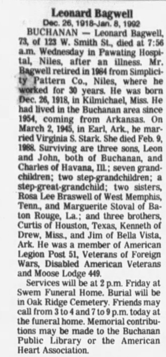 Leonard Bagwell was born on 26 December 1918 in Kilmichael, Mississippi. He was the son of Charlie Alexander Bagwell and Nina Bell Love. Leonard Bagwell lived in 1940 in Mississippi State Tuberculosis Sanatorium, Simpson, Mississippi, as a patient. He married Virginia Lee Stark on 2 March 1946 at Marion County, Arkansas. Leonard Bagwell died on 8 January 1992 in Pawating Hospital, Niles, Michigan, at age 73. He was buried on 9 January 1992 at Oak Ridge Cemetery, Buchanan, Berrien County, Michigan.