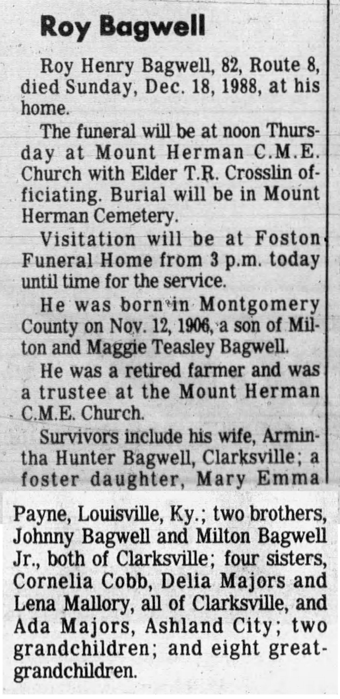 Roy Henry Bagwell was born on 12 November 1906 in Tennessee.1,2 He was the son of Milton John Wesley Bagwell and Maggie Shelby.1 Roy Henry Bagwell married Deannie Armenthia Hunter in 1929.2 Roy Henry Bagwell died on 18 December 1980 in Clarksville, Montgomery County, Tennessee, at age 74.1,2 He was buried on 22 December 1988 at Mt Herman Community Church Cemetery, Hickory Point, Montgomery County, Tennessee.1