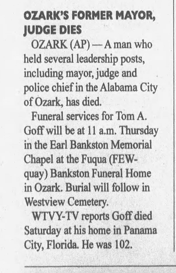 - Thomas Amon Goff+ b. 13 Jul 1917, d. 5 Oct 2019