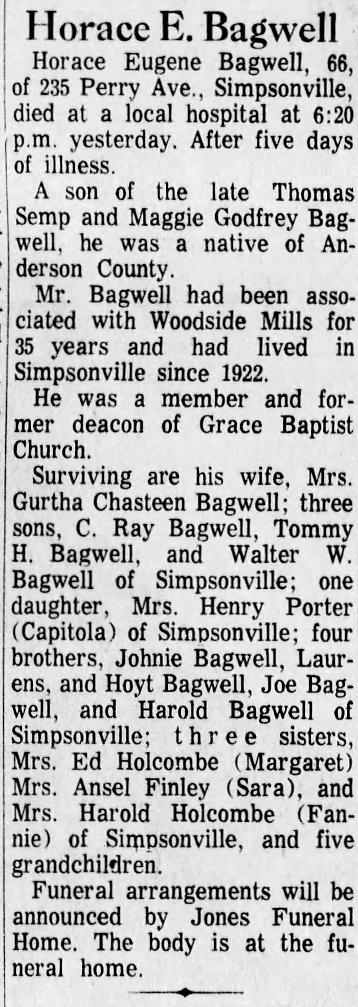 - Horace Eugene Bagwell+ b. 16 Apr 1901, d. 20 Aug 1967