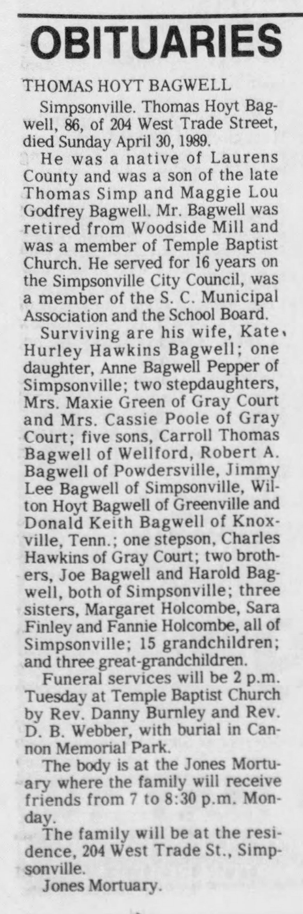 Thomas Hoyt Bagwell was born on 3 March 1903 in South Carolina. He was the son of Thomas Simpson Bagwell and Maggie Lou Godfrey. Thomas Hoyt Bagwell married Nellie Mae Abercrombie after 1922.1 Thomas Hoyt Bagwell married Eunice Mostella before 1940. Thomas Hoyt Bagwell married Kate Fannie Hurley Hawkins after 1978. Thomas Hoyt Bagwell died on 30 April 1989 in Easley, Pickens County, South Carolina, at age 86. He was buried on 2 May 1989 at Cannon Memorial Park, Fountain Inn, Greenville County, South Carolina.