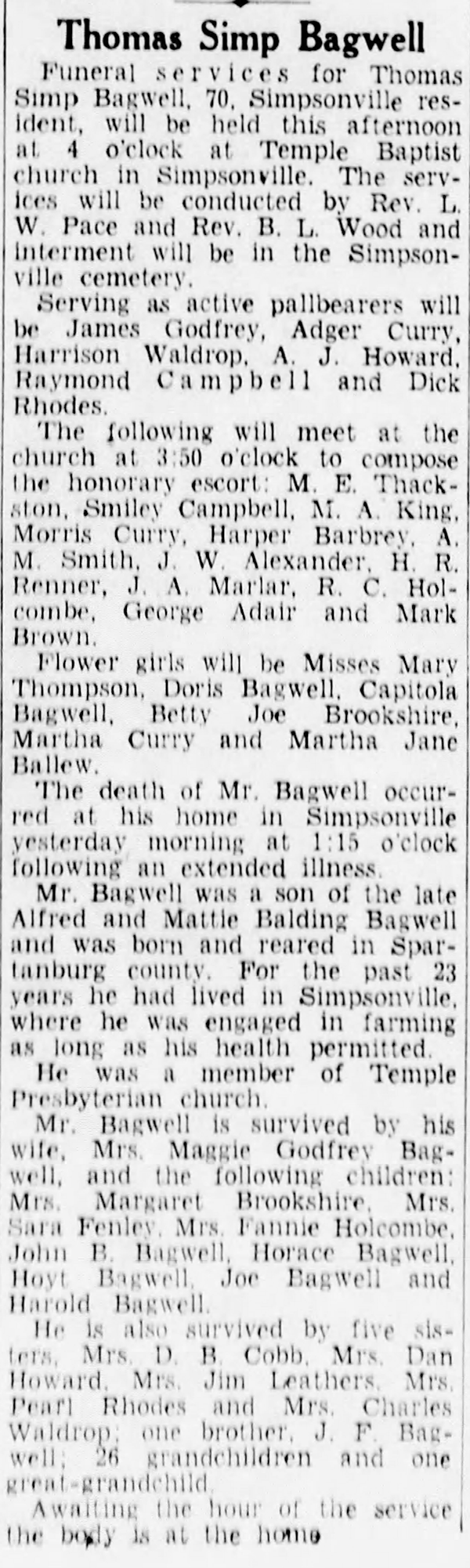 Thomas Simpson Bagwell was also known as Simpson Bagwell. Thomas Simpson Bagwell also went by the name of Simp. He was born on 28 January 1874 in Spartanburg County, South Carolina.2,1 He was the son of Alford Bagwell and Mattie Bolding.1 Thomas Simpson Bagwell married Maggie Lou Godfrey before 1894. Thomas Simpson Bagwell died on 25 November 1943 in Simpsonville, Greenville County, South Carolina, at age 69.1,2 He was buried at Simpsonville Municipal Cemetery, Simpsonville, Greenville County, South Carolina.2