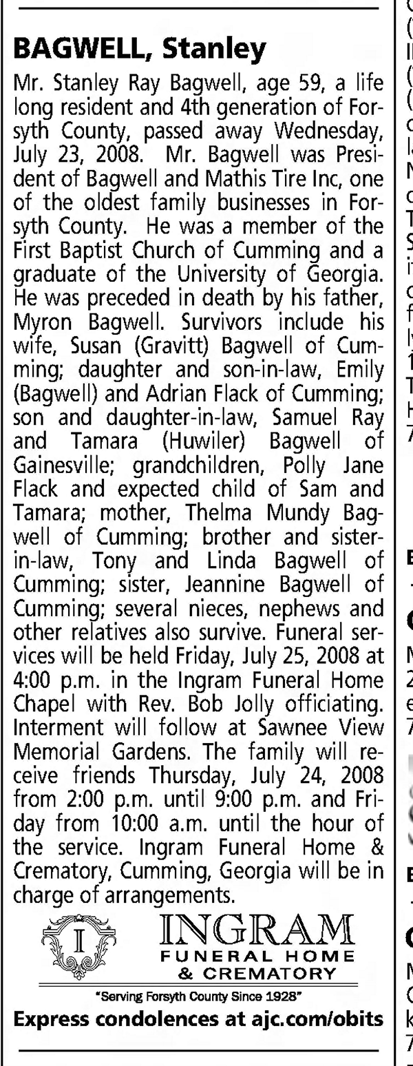 Stanley Ray Bagwell,a life long resident and 4th generation of Forsyth County. Mr. Bagwell was President of Bagwell and Mathis Tire Inc, one of the oldest family businesses in Forsyth County. He was a member of the First Baptist Church of Cumming and a graduate of the University of Georgia. He was preceded in death by his father, Myron Bagwell.