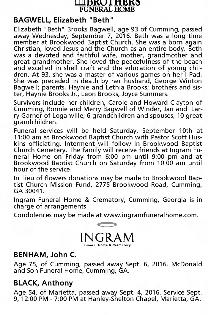 Elizabeth "Beth" Brooks Bagwell, age 93 of Cumming, passed away Wednesday, September 7, 2016. Beth was a long time member at Brookwood Baptist Church. She was a born again Christian, loved Jesus and the Church as an entire body. Beth was a devoted and faithful wife, mother, grandmother and great grandmother. She loved the peacefulness of the beach and excelled in shell craft and the education of young children. At 93, she was a master of various games on her I Pad. She was preceded in death by her husband, George Winton Bagwell; parents, Haynie and Lethia Brooks; brothers and sister, Haynie Brooks Jr., Leon Brooks, Joyce Summers.
