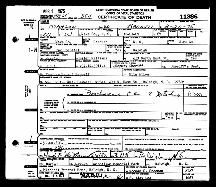 Louis D. Bagwell was born on 16 May 1917 in Wake County, North Carolina.1 He was the son of Zeb Bagwell and Allie Sealey.1 Louis D. Bagwell married Annie Lou Williams before 1943.2 Louis D. Bagwell married Christine B. Jones on 20 September 1947.3 Louis D. Bagwell lived in 1964 in Raliegh, North Carolina. He died on 5 November 1969 in Raliegh, Wake County, North Carolina, at age 52.1 He was buried on 7 November 1969 at Montlawn Memorial Park, Raleigh, Wake County, North Carolina.1