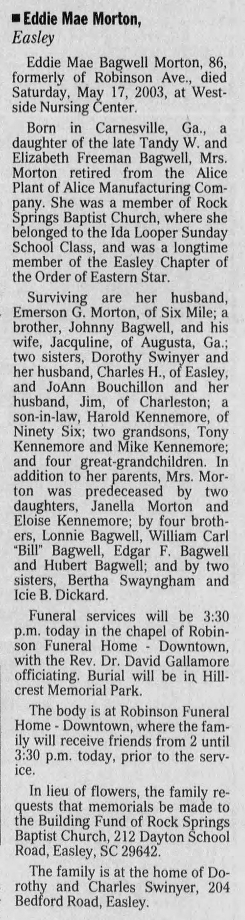 Eddie Mae Bagwell was born on 21 April 1917 in Georgia. She was the daughter of Tandy Walker Bagwell and Elizabeth Della Freeman. As of before 1940,her married name was Morton. Eddie Mae Bagwell married Emerson Govnor Morton before 1940. Eddie Mae Bagwell died on 17 May 2003 at age 86. She was buried at Hillcrest Memorial Park, Pickens, Pickens County, South Carolina.
