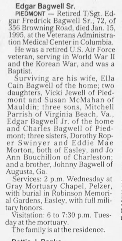 Edgar Frederick Bagwell was born on 22 August 1922 in Georgia. He was the son of Tandy Walker Bagwell and Elizabeth Della Freeman. Edgar Frederick Bagwell married Ella Cain after 1938. He was a T/Sgt. in the US Army/US Air Force during World War II and Korean War. Edgar Frederick Bagwell died on 15 January 1995 in Pickens County, South Carolina, at age 72. He was buried on 18 January 1995 at Robinson Memorial Gardesn, Easley, South Carolina.