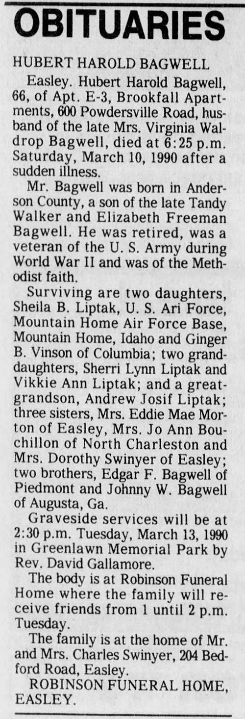 Hubert Harold Bagwell was born on 7 February 1924 in Anderson County, South Carolina.1 He was the son of Tandy Walker Bagwell and Elizabeth Della Freeman.1 Hubert Harold Bagwell married Virginia E. Waldrop after 1940.2 He was a US Army, World War II veteran. Hubert Harold Bagwell died on 10 March 1990 at age 66.1 He was buried at Greenlawn Memorial Park, Easley, Pickens County, South Carolina.1