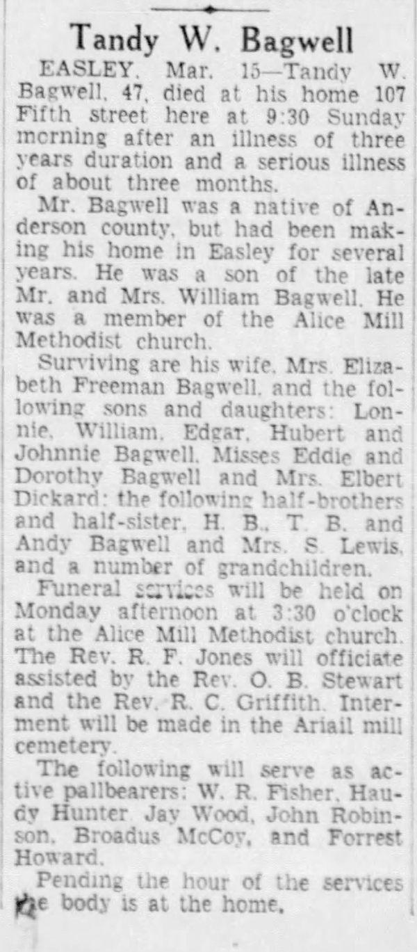 Tandy Walker Bagwell was born on 13 December 1889 in Hart, Georgia.1 He was the son of William Henry Bagwell and Martha Thompson. Tandy Walker Bagwell married Elizabeth Della Freeman before 1909. Tandy Walker Bagwell died on 15 March 1936 in Easley, Pickens County, South Carolina, at age 46 of Tuberculosis.1 He was buried at Arial United Methodist Church Cemetery, Arial, Pickens County, South Carolina.1