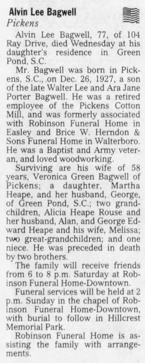 Surviving are his wife of 58 years, Veronica Green Bagwell of Pickens; a daughter, Martha Heape and her husband, George, of Green Pond, SC; two grandchildren, Alicia Heape Rouse and her husband, Alan, and George Edward Heape and his wife, Melissa; two great-grandchildren; and one niece. He was preceded in death by two brothers.